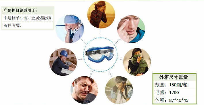 PC镜片、PVC轻巧设计,特为亚洲人面型设计、更加立体、贴合 镜体柔软、头带宽大、佩戴舒适 镜片防刮擦、等级高、视野宽阔 适用:中速粒子冲击、金属熔融物、液体飞溅 符合EN166标准认证 编码:02-2735 包装:150副/箱