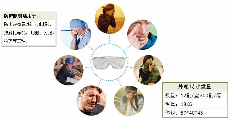 镜架透明、侧边通风,可与光学眼镜同时佩戴,尤其适合参观者。 通过EN166标准认证。 包装:12副/盒 、300副/箱