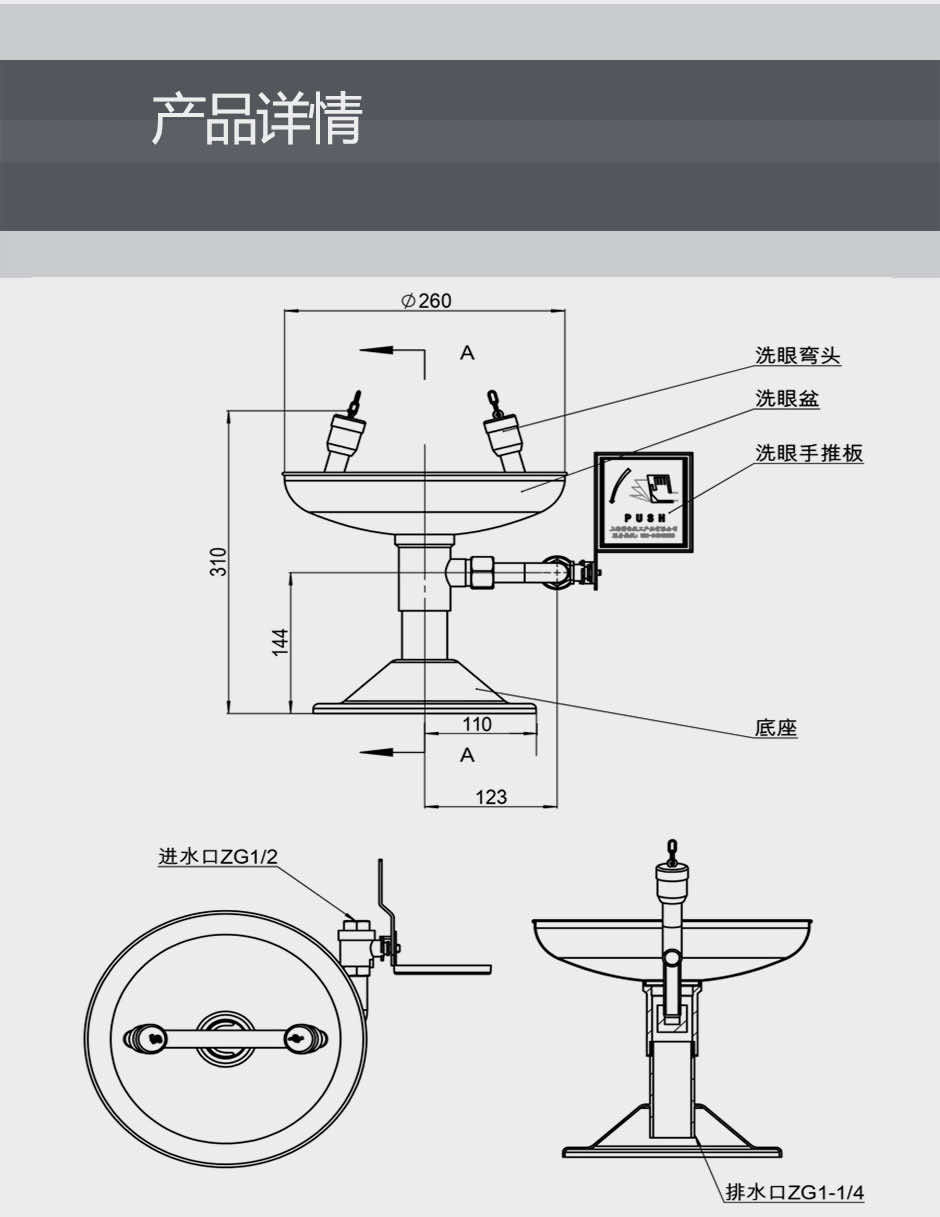 主体材质:304不锈钢 底 座:铝合金压铸 执行标准:美标ANSI Z 358.1-2014