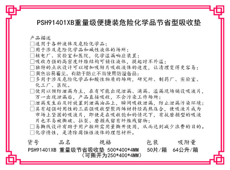 新络 CP2002X 粉色2MM厚酸性液体吸酸棉危害品万用型吸附垫(48x38cmx2mm,200片/箱 )