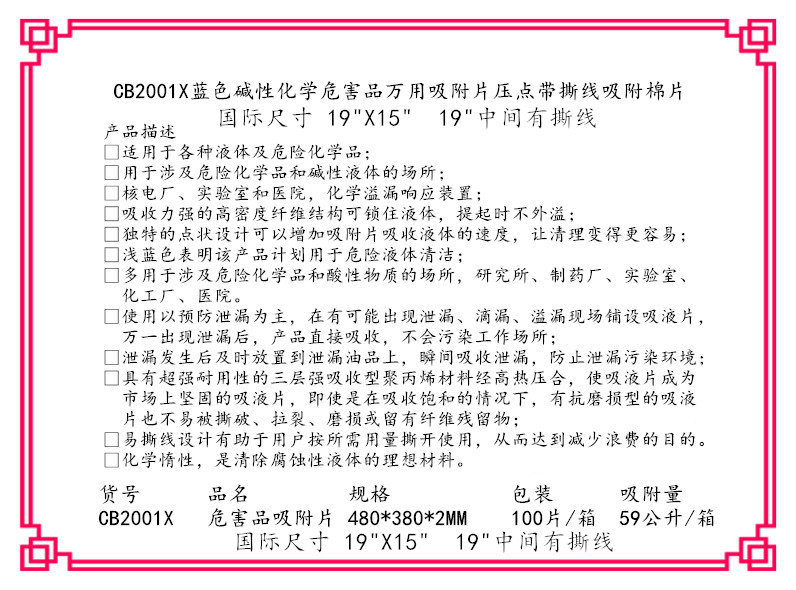 新络 CP2002X 粉色2MM厚酸性液体吸酸棉危害品万用型吸附垫(48x38cmx2mm,200片/箱 )
