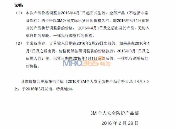 (1)本次产品价格调整自2016年4月1日起正式生效。全部产品(不包括非常备库存)的价格以3M公司实际出货日的价格为准,即2016年4月1日前出货的产品执行调整前的价格,2016年4月1日及之后出货的产品,无论入单日期的早晚,一律执行调整后的价格。