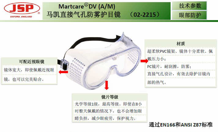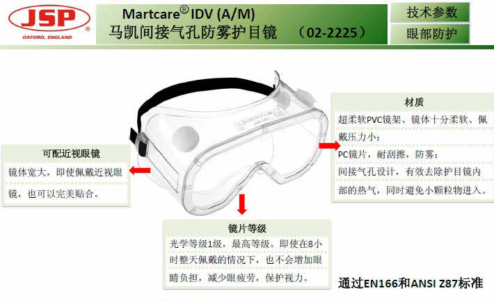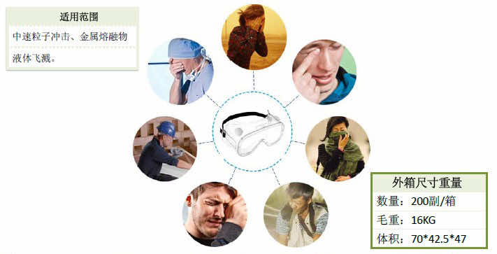 PC镜片,PVC镜体,镜体十分柔软,密封边沿,佩戴舒适; 镜片防刮擦,等级高,视野宽阔。 适用:中速粒子冲击、金属熔融物、液体飞溅。 通过欧洲EN166和美国ANSI Z87标准认证。 包装:200副/箱