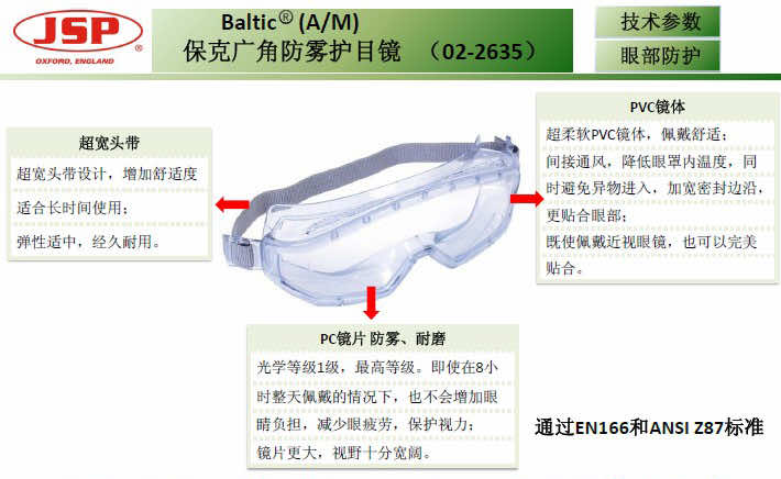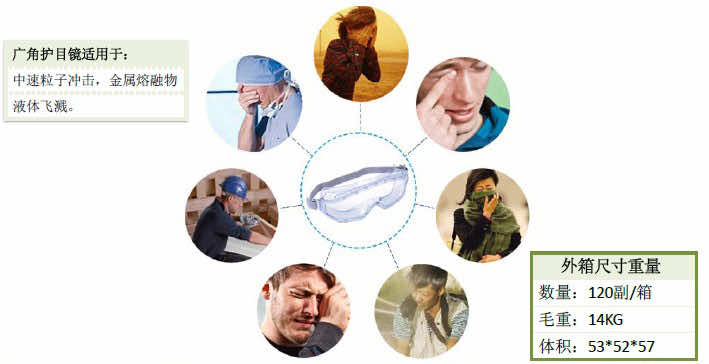 PC镜片,PVC镜体,镜体十分柔软,加宽密封边沿,佩戴舒适; 镜片防刮擦,防雾,等级高,镜片大,视野十分宽阔。 适合亚洲人脸型。 适用:中速粒子冲击、金属熔融物、液体飞溅。 通过欧洲EN166和美国ANSI Z87标准认证 包装:120副/箱