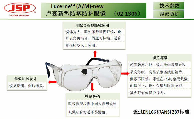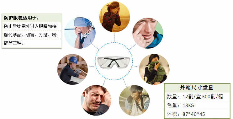 镜架透明、侧边通风; 增加了镜腿可调节功能,使用更灵活。 通过EN166标准认证。 包装:12副/盒 、300副/箱