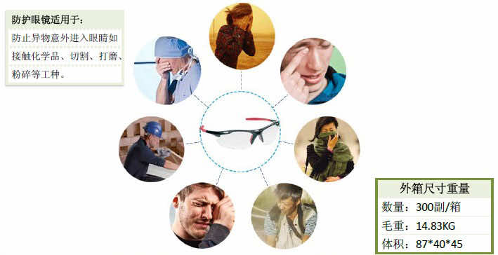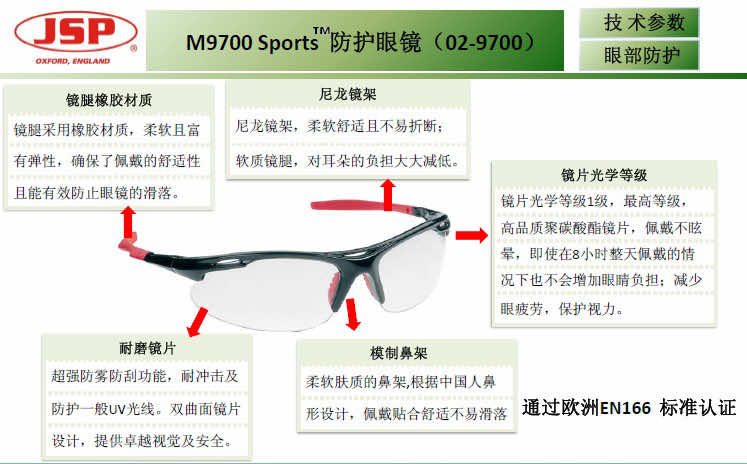 红色鼻梁架及镜腿采用橡胶材质,柔软且富有弹性,确保了佩戴的舒适性且能有效防止眼镜的滑落; 透明镜片,耐冲击及防护一般UV光线; 双曲面镜片设计,提供卓越的视觉及安全效果; 镜片防刮擦、防雾。 符合EN166标准认证。 包装:12副/盒 、300副/箱