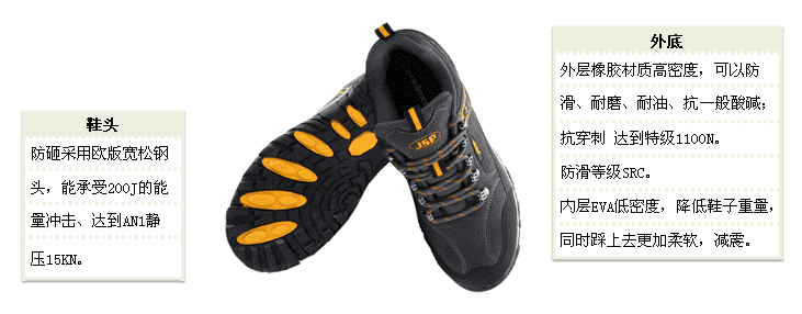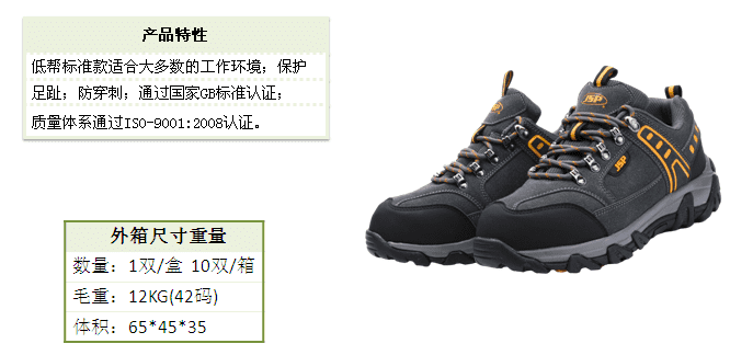 低帮标准款适合大多数的工作环境;保护足趾、防穿刺功能;