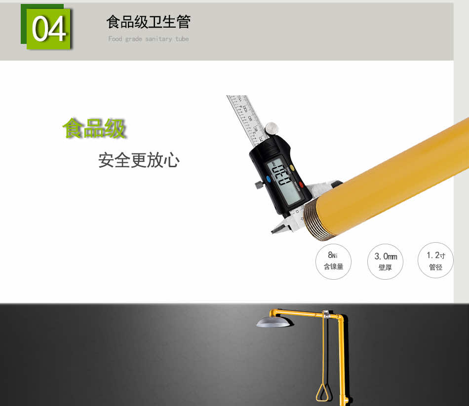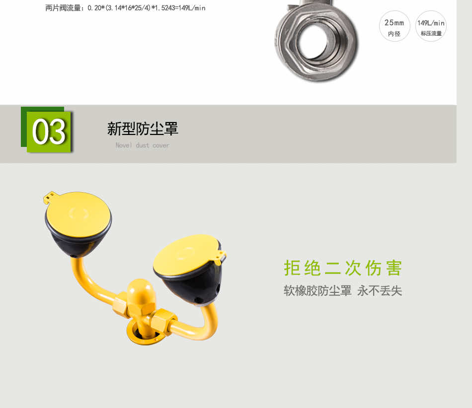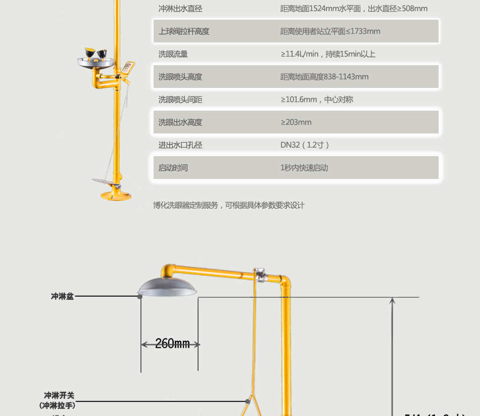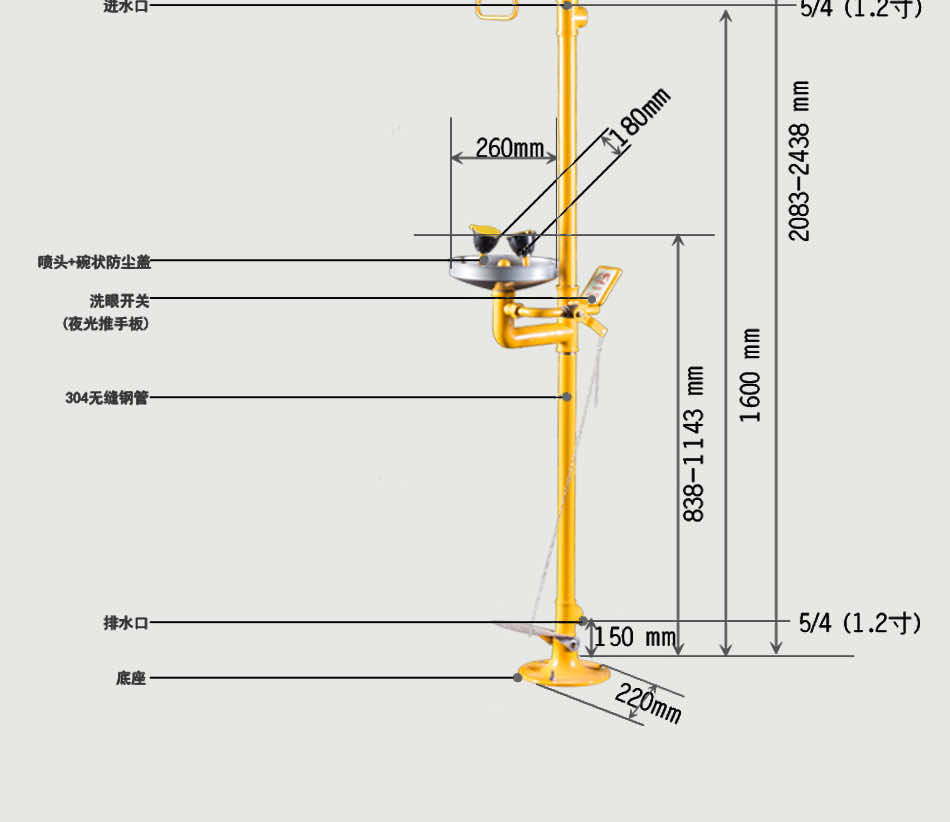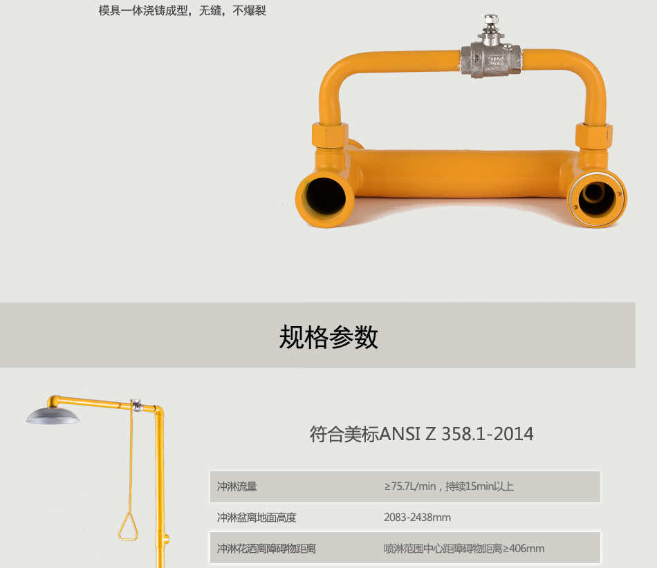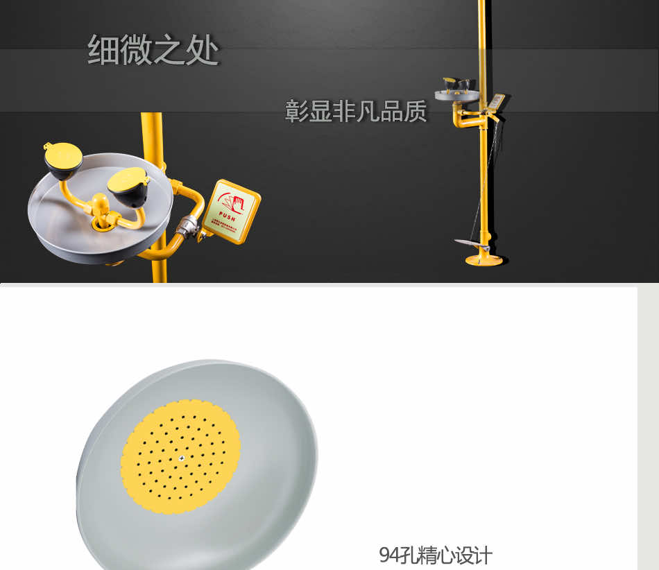 主体材质:304不锈钢+ABS防腐涂层 底 座:铝合金压铸 执行标准:美标ANSI Z 358.1-2014