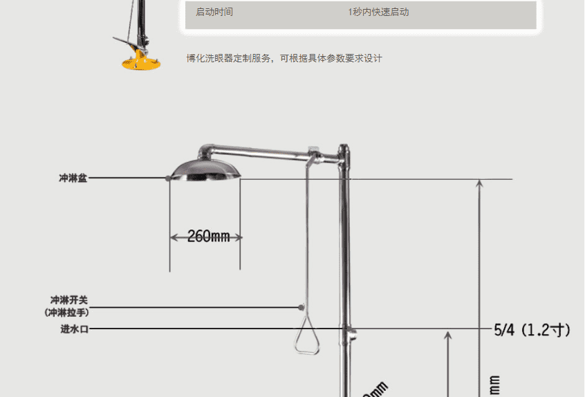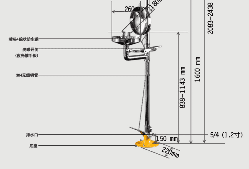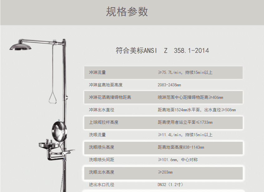 主体材质:304不锈钢 底 座:铝合金压铸 执行标准:美标ANSI Z 358.1-2014