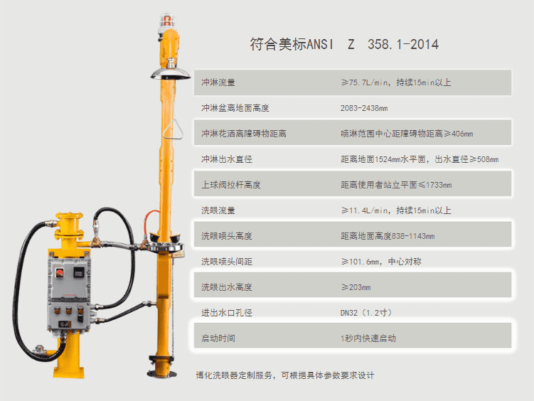 主体材质:304不锈钢 防护等级:IP65 执行标准:美标ANSI Z 358.1-2014