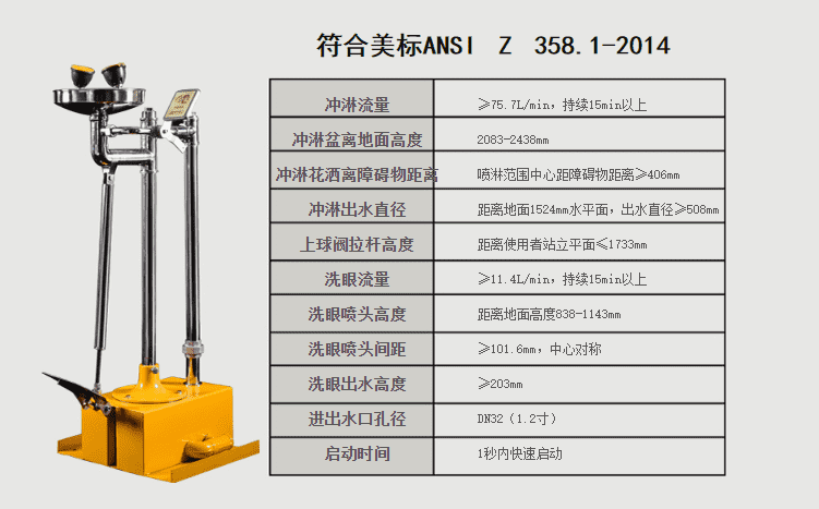 主体材质:304不锈钢 底 座:304不锈钢 执行标准:美标ANSI Z 358.1-2014